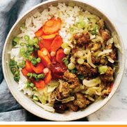 Egg Roll in a Bowl! Ground pork browned with garlic and ginger, sautéed carrots and cabbage cooked down in some soy sauce and chili paste, a nice little heap of hot rice. YUM.