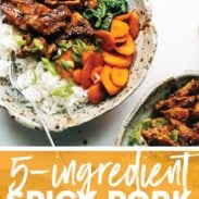 Bowl extras: I like to serve these with rice and sautéed carrots and greens. Just throw the carrots and greens in the pan after the pork is cooked to get all that yummy flavor. Cook rice according to package directions.