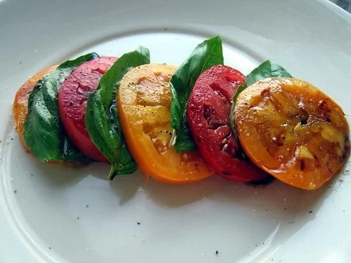 I made an absolute effort, when writing my book, not to rehash any old material from the blog. I wanted each chapter to feature an entirely new story, a new experience that would excite loyal readers who’ve been reading me from the beginning as well as new readers who’d discover me in the book store. What you may not know, however, is that as I wrote the book, I would post pictures that correlated to specific chapters without revealing their ultimate destination. For example, when I did the post Farmer’s Market Bounty in August 2005 you didn’t know that this red and yellow tomato salad would figure prominently on pg. 34, did you?