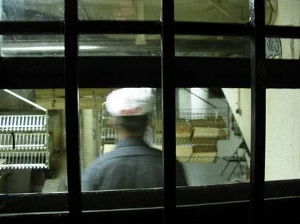 Certain experiences belong in that well-worn jar on the mantle: “Only In New York.” Take the experience I had the other night before joining Craig for our second anniversary dinner at wd-50 (post to follow). I was in the Lower East Side, walking on Clinton Street (or was it Rivington?) and I noticed a humming noise and a light from a window on my left. I leaned in and saw what you see in the picture above: Asian men in hats making matzoh. Now I’ve been eating matzoh my whole life–mostly on Passover–and I’d always assumed matzoh was made in mysterious Jewish factories with men dressed like Moses singing songs from “Fiddler On The Roof” and shoving stacks and stacks of the dry, unleavened cracker-like rectangles into boxes. But here, right before my eyes, matzoh was being made. I snapped that picture and a few seconds later a man came outside and said: “Would you like to try some?”