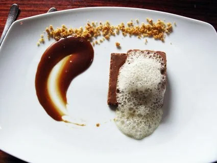 I think it does. Almost like a fraternity hazing ritual, where the brothers all take the plate into the kitchen and spit on it and bring it out and call it foam. Sorry if that disturbed you, but if that’s what this dessert evokes, has it failed in some way? And really, is foam really worth it anymore? I feel like that fad is over–it was novel for a quick moment–but it just doesn’t have legs. I don’t crave foam the way I crave, say, whipped cream. In fact, I would have preferred whipped cream on this dessert–it would have both looked and tasted better than foam.