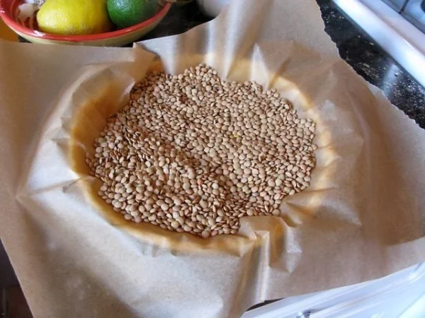 Then, when it came time to remove the lentils to bake the crust uncovered for a little bit I had a little accident: