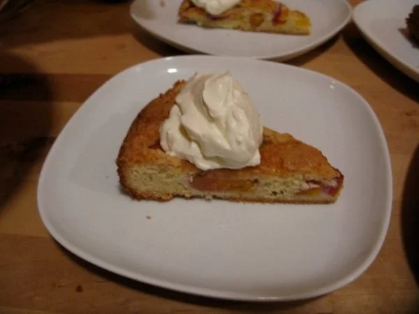 The dessert in question was a nectarine cake I blogged about last year (click here for that post and the full recipe.) It’s a truly simple recipe: you make a batter with butter, sugar, eggs, vanilla extract and almond extract, spread the batter in a springform pan, slice two nectarines and neatly place the slices around the top and then sprinkle everything with nutmeg and sugar. You bake and out it comes looking beautiful: