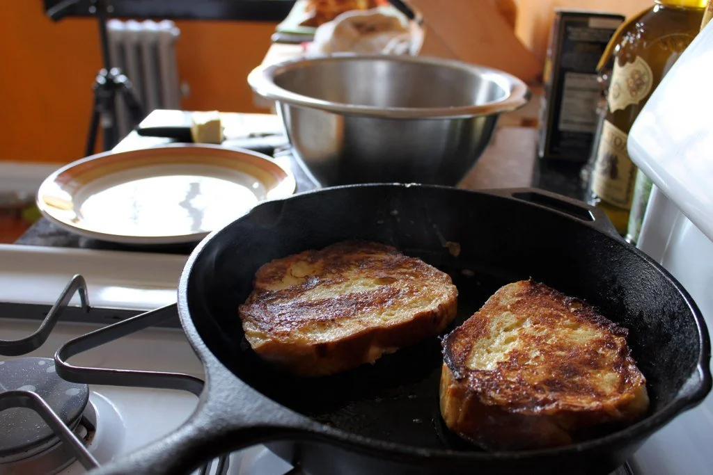 Dip your challah into the egg mixture (drag it through on both sides), drain it off then add it to the hot buttery skillet. Cook for a minute or two until golden brown on one side, then flip it: