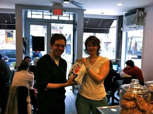 Well, folks, today was the big day. At 9:30 AM I met with Lizzie, my constant companion and photographer over the past year, so she could hand over the discs with all of her pictures and the match prints (hard copies) for me to deliver, along with my manuscript, to my publisher, Artisan Books. And so it was that after we sipped cappuccino (Lizzie) and iced coffee (me) and Brendan the barrista kindly snapped that photo you see above, I journeyed south on 6th Avenue down to Houston, over to Varick and up the elevator to my publisher to hand things over.