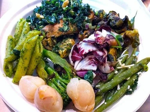 Note the diversity on the plate I made for myself last week: starting at 12 o’clock there’s a raw kale salad, there’s marinated & grilled chicken, there’s a radicchio salad, roasted Brussels sprouts, lemon-coated string beans, roasted broccoli, penne with pesto and, at 6 o’clock, three lychees.