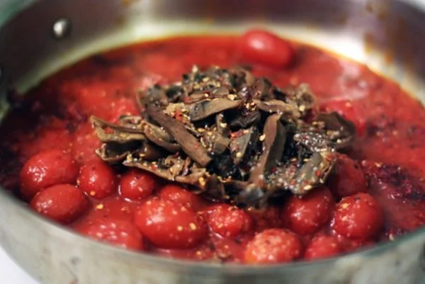 - Meanwhile, heat the olive oil in a skillet or sauté pan over medium heat. After a minute, add the tomato paste and cook, stirring occasionally, for 4 to 5 minutes. Add the cherry tomatoes and the liquid they’re packed in, the chili condiment, and the drained porcini.