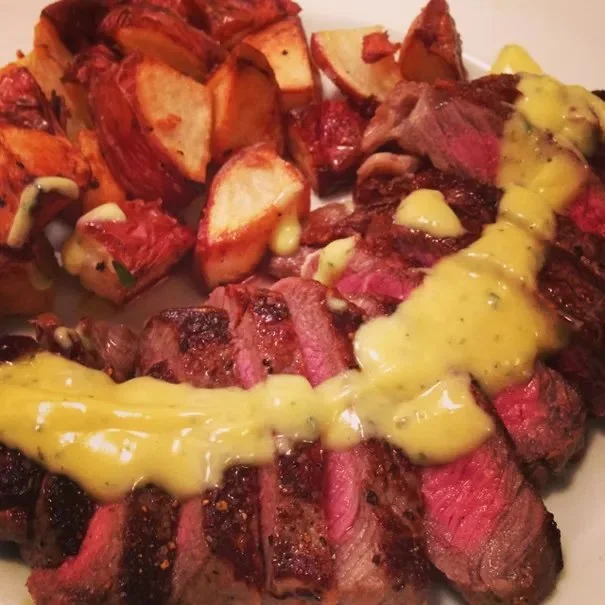 I mean, really. Béarnaise in a manner of seconds. Here it is, served in a ramekin, alongside Friday’s steak and potatoes: