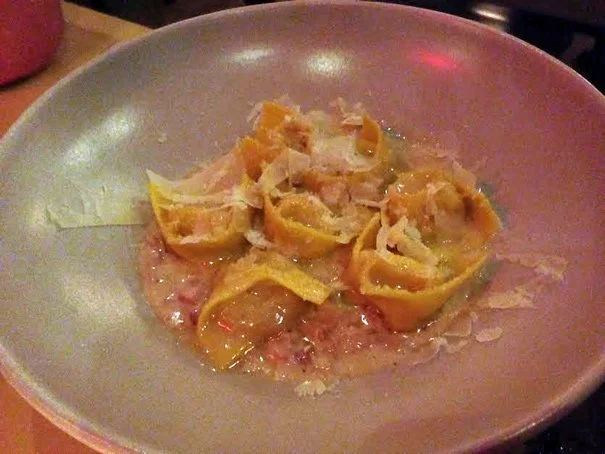 “Also, it’s a way for kitchens with limited resources to make sure they don’t get too slammed.” She pointed out that unlike Sotto, where there’s a big vat of boiling water for cooking various pastas at once, Alimento only has room for one pasta dish at a time. Almost to illustrate the point, the pasta that Craig ordered for his entree–a remarkable tortellini in brodo dish where the brodo (or broth) was inside the tortellini like a soup dumpling–arrived at the table by itself.