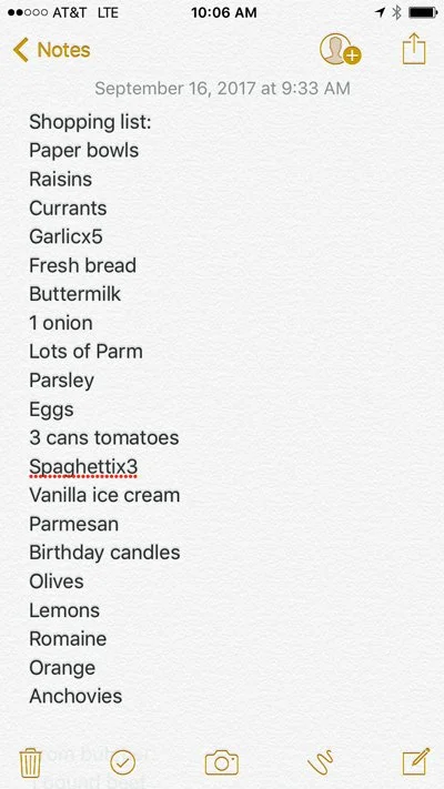 8:46 AM I wake up (was at another birthday in Pasadena the night before, too many of my friends have birthdays, so was feeling a little groggy) and finalize my shopping list, consulting the various recipes I plan to make that day. I do my shopping list in the notes app. Here it is in all its glory: