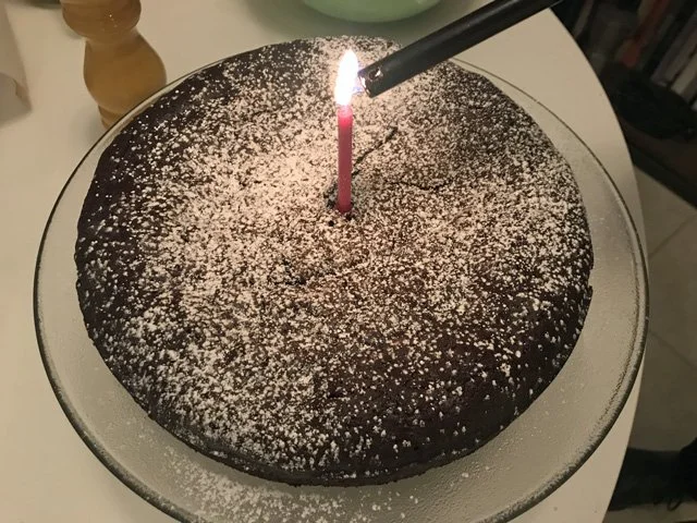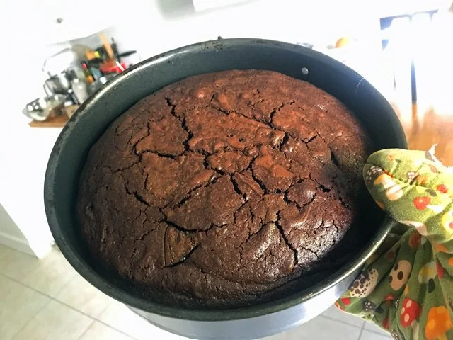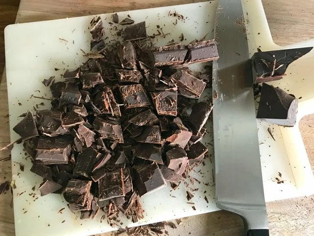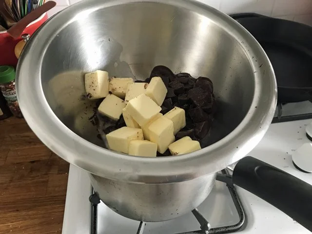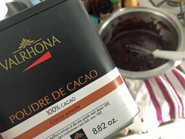 12 PM Make the cake! This is such an easy cake to make. (Again, here’s the recipe.) You basically just chop chocolate, put it in a bowl with butter, put the bowl on top of a pot of simmering water until everything melts, then stir in sugar, eggs, and, finally cocoa powder. I used the good stuff, some Valrhona I bought in Echo Park