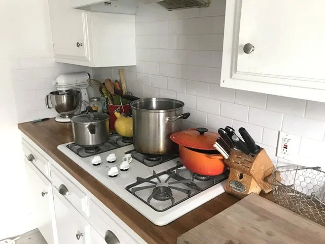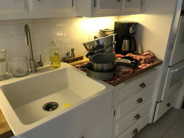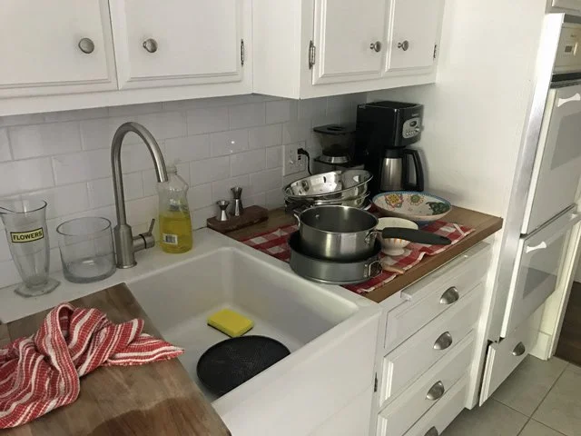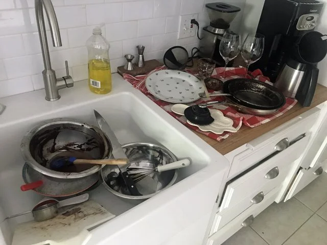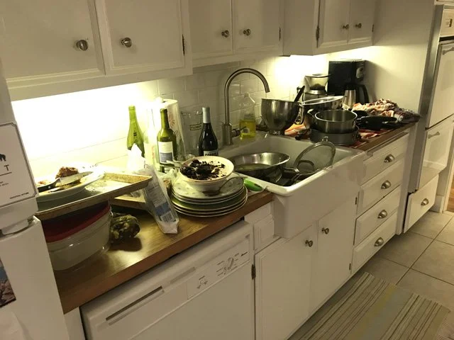 2 PM Clean up the cake and lunch mess. This is probably the most important thing I can teach you about hosting a dinner party: clean EVERYTHING as you go along, or you will have a disaster of epic proportions by the time the real cooking rolls around.