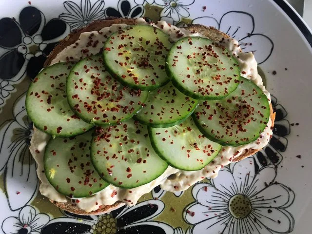 12:46 PM While the cake’s baking, I make lunch for myself. I had some chickpeas and some fancy Soom Tahini I also bought at Cookbook in Echo Park, so I mashed those up together with lots of lemon juice, salt, and olive oil. I toasted rye bread, put the chickpea mash on top, and added a sliced cucumber with more lemon juice, olive oil, salt, and Aleppo pepper. A good light lunch for a big cooking day!