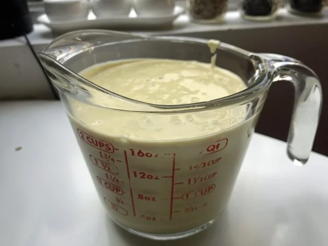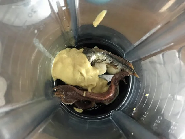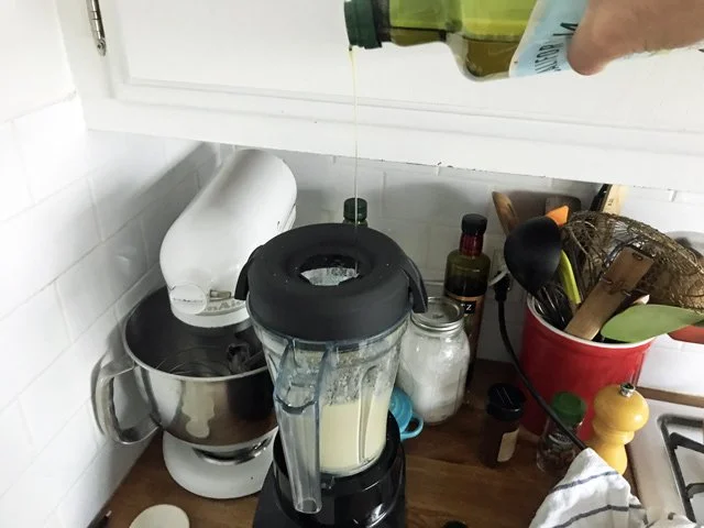 Then a big pinch of salt, some pepper, the lid goes on, the blender goes on, and I slowly pour in about 3/4ths a cup of olive oil, until thick: