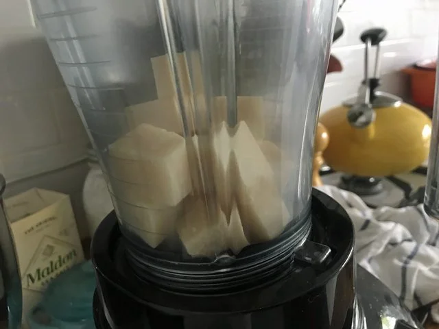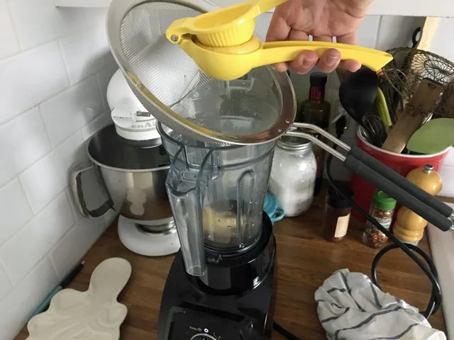 Then lots of lemon juice (from two lemons) squeezed through a strainer straight into the blender: