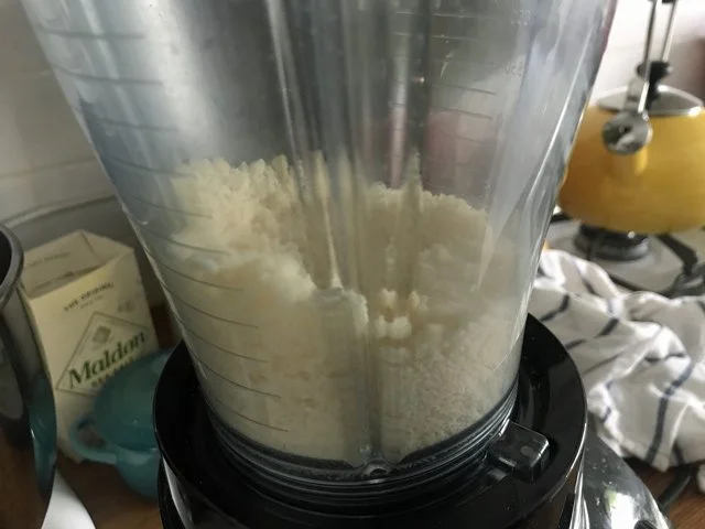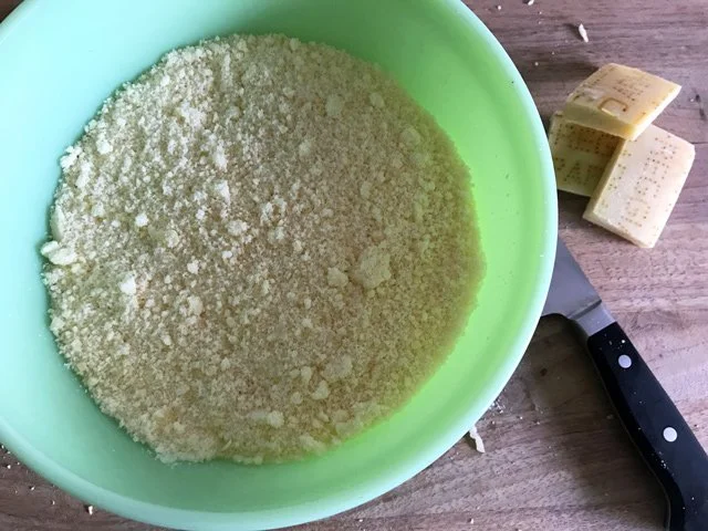 So I cleaned the blender, after making the dressing, and then cut three wedges of really good Parmesan (it makes a big difference, God I’m so Ina-influenced) into cubes and, in little groups, popped them into the blender to be pulverized.