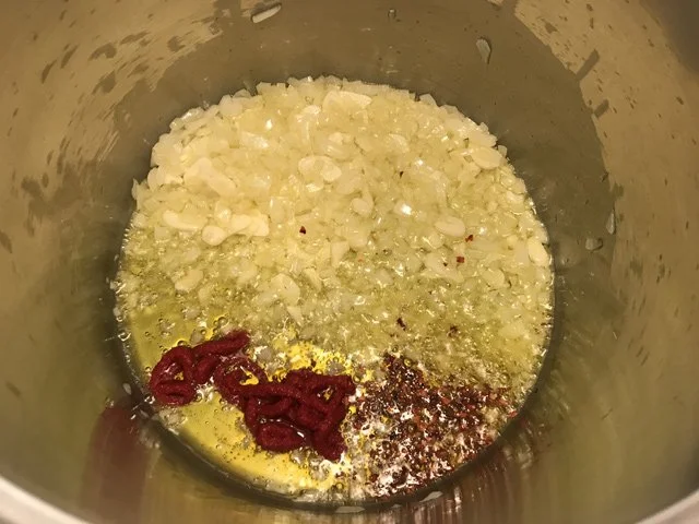 5:06 PM Start sauce. So the meatball recipe I used (a pretty irrefutable one from Serious Eats) said you can make any kind of tomato sauce. So I got out my stockpot and made a sauce with lots of olive oil, lots of chopped onion, lots of garlic, tomato paste, and chile flakes that I cooked a bit together to infuse the oil and to get a little toasty: