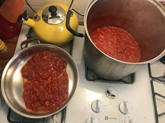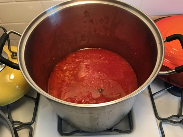 Then I added three cans of San Marzano tomatoes (crushed by hand) and a big pinch of salt: