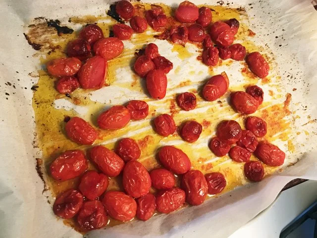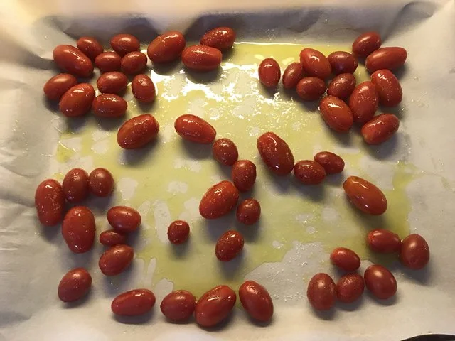 5:44 PM Roast cherry tomatoes for the Caesar salad. This is an easy trick (OK, another Ina trick) where you roast cherry tomatoes on a cookie sheet in a hot oven with olive oil, salt, and pepper until they burst and get a little charred: