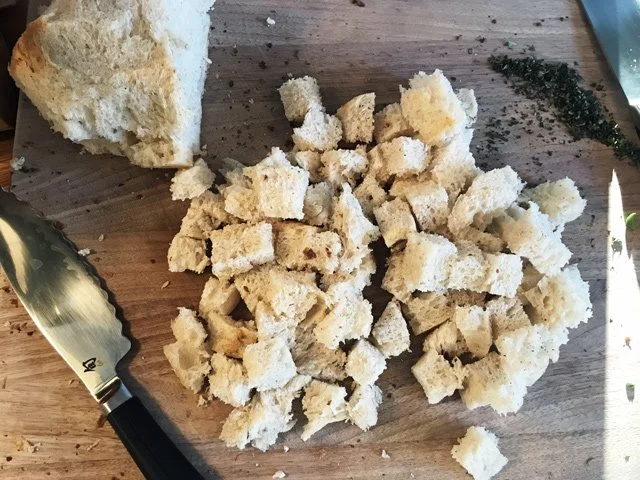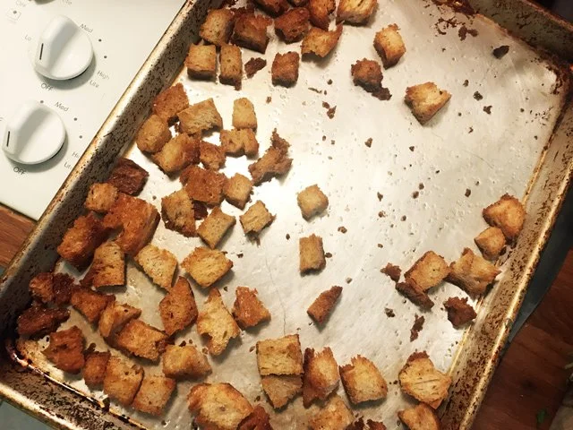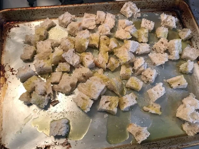 I actually had too much bread so when the tomatoes came out of the oven, I decided to use the extra cubes to make croutons. It was this easy: tossed the cubes with olive oil, salt, and pepper and popped into the 400 degree oven until they were golden all over.