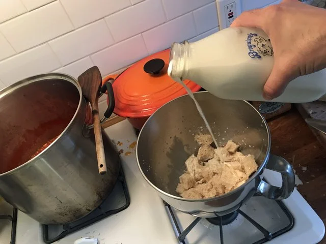 6 PM Start making the meatballs. This recipe is pretty epic (again, here’s the link); I skipped the whole thing where you gelatinize chicken stock and chop that for your meatballs. But I did buy good bread, cut the crusts off, cut the insides into cubes, soak the cubes in whole milk, etc, etc.
