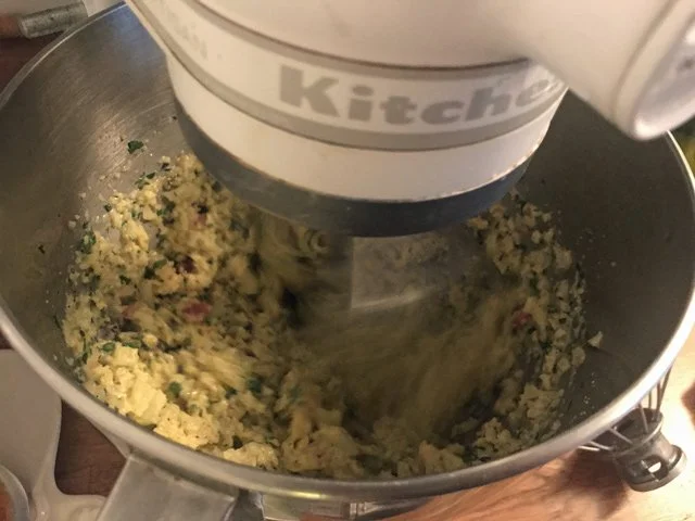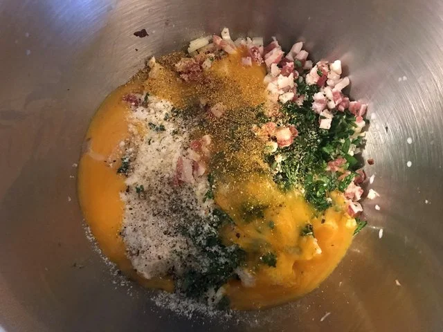 The recipe’s really cool in that you use a stand mixer to whip together the milk-soaked bread, onion, garlic, oregano, parsley, ground fennel seed, egg yolks, and minced pancetta.