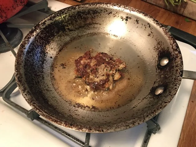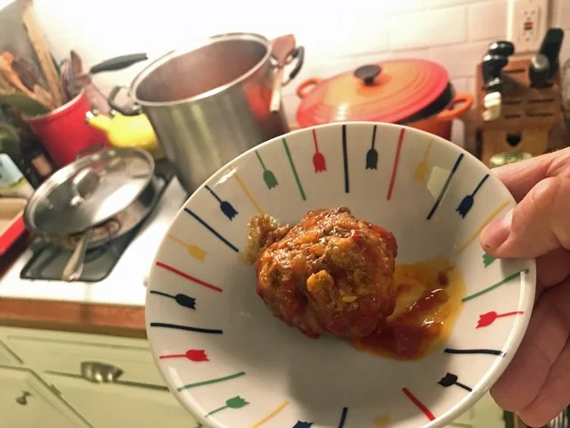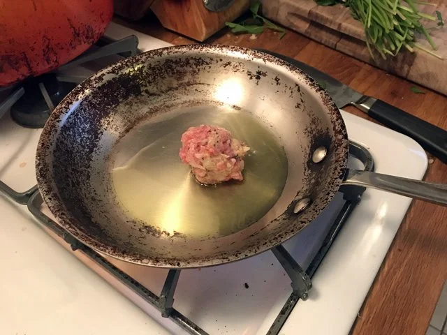 7 PM Make a test meatball. This was a trick Sara Moulton taught me when I wrote my cookbook and I never forgot it: when making a meat mixture that you can’t taste raw, fry up a little bit so you can taste for seasoning. So that’s exactly what I did in a little pan with some olive oil: