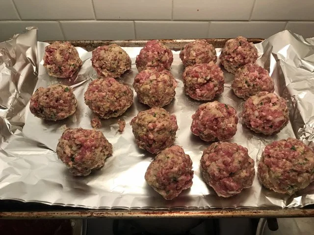 To that mixture, you add 1/3rd of your meat (I used a mixture of pork and ground beef from McCall’s) so that it really gets worked in, then you add the rest with your hands to keep the meatballs light.