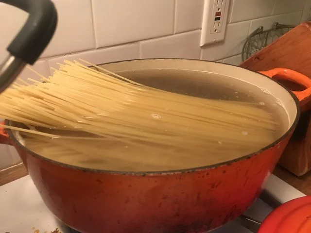 8:55 PM Cleared the salad plates and when the water was boiling, I salted it aggressively, and then dropped in two pounds of spaghetti.