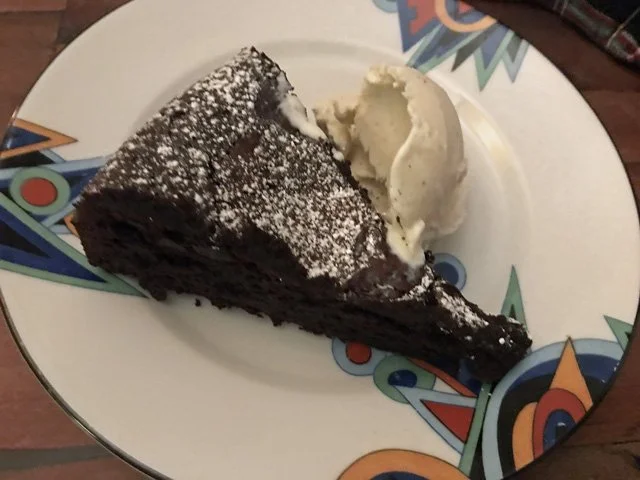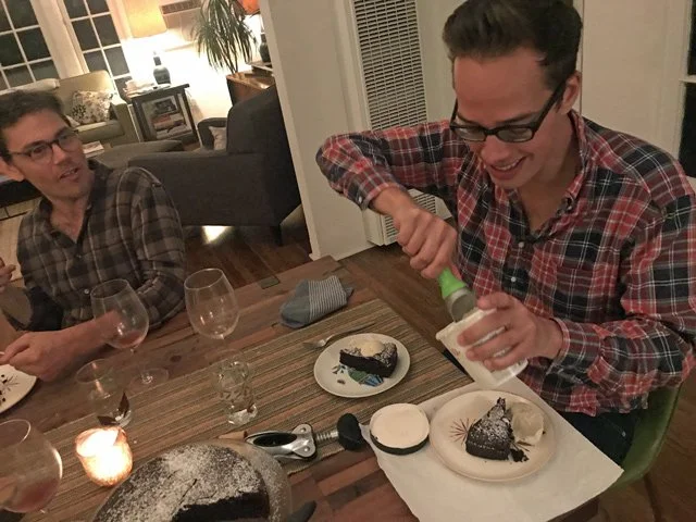My friend Ryan O’Connell is one of my favorite people. If you don’t know who he is, hop on to Amazon now and check out his book, I’m Special, and come back here once you’ve bought it and read it. Not only did he write that book, but now he’s writing for fall’s most anticipated TV show: the reboot of Will & Grace. So Ryan’s a talented guy who has great taste in wine and even better taste in dinner parties: he loves my cooking. For his birthday, I told him I’d make him a dinner and he could choose the menu. He thought on it and came back with “spaghetti and meatballs, because I know you’ll do it really, really well.” His boyfriend Jonathan loves my Caesar salad, so we added that to the menu. Later I e-mailed to query about his favorite desserts and he wrote back: “My fave desserts are chocolate cake, chocolate pudding, and strawberry shortcake.” I combined a little from Column A and a little from Column B and chose my favorite dinner party staple, this flourless chocolate cake.