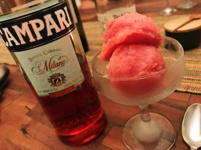 So you can see why, after such a heavy, rib-sticking entree, I’d want to go for sorbet. And what a sorbet this is! The key ingredient is my favorite cocktail ingredient (I’m a Negroni man): Campari.