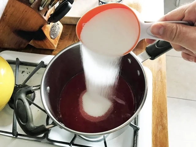 This whole thing is really easy, as long as you have an ice cream maker. I’m even going to give you the recipe, so listen up. Combine 2 cups freshly squeezed ruby red grapefruit juice, 1/4 cup freshly squeezed lemon juice, and 1/2 cup of freshly squeezed orange juice in a bowl. Pour one cup of that into a small saucepan with one cup of granulated sugar.