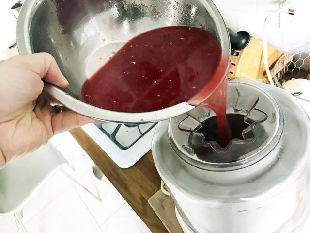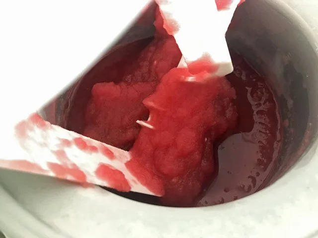 When the liquid is cold to the touch, get out your ice cream maker and pour in the Campari mixture and start churning. It takes about twenty minutes… Ottolenghi says you’ll know it’s done when “soft waves form.”