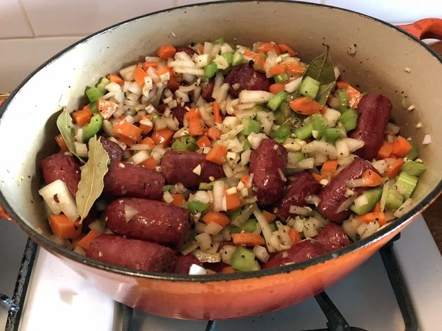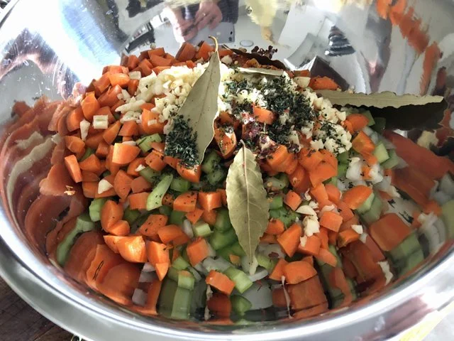 Now it’s time for your vegetables: onions, celery, carrots, garlic, bay leaves (are bay leaves a vegetable?), red pepper flakes, and fresh thyme.