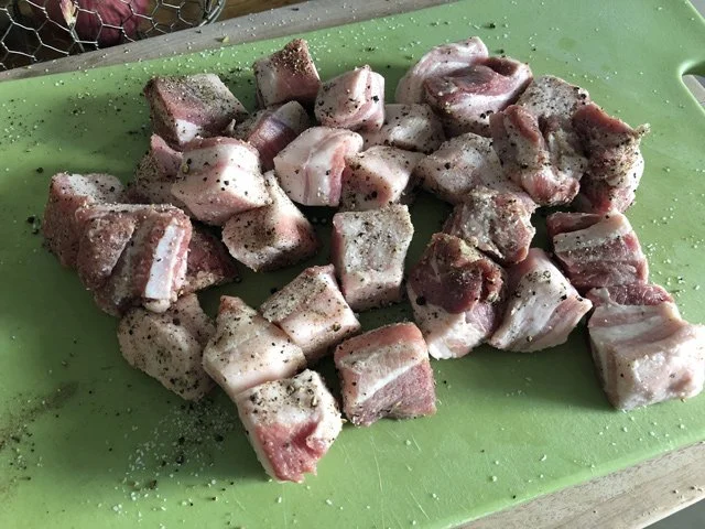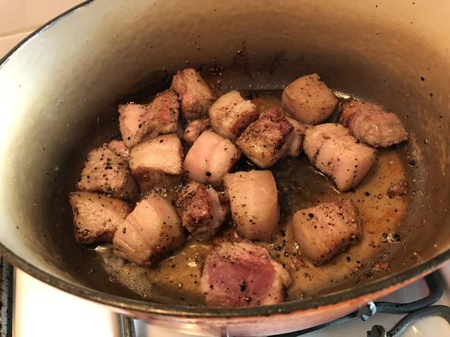 Here’s how easy it is to make cassoulet: cut that pork belly into 1-1/2 inch cubes and season with lots of salt and pepper.