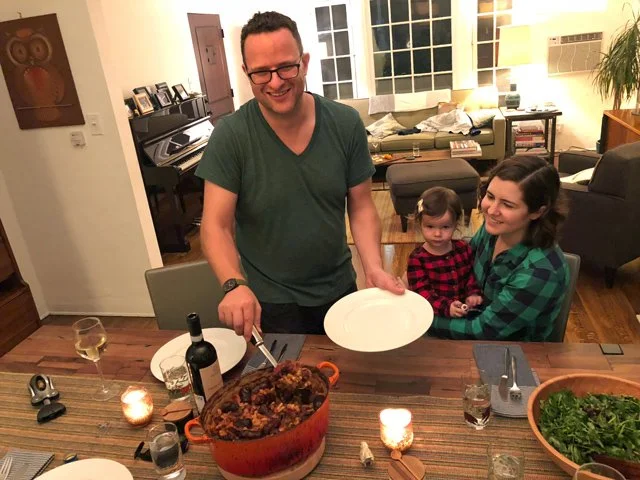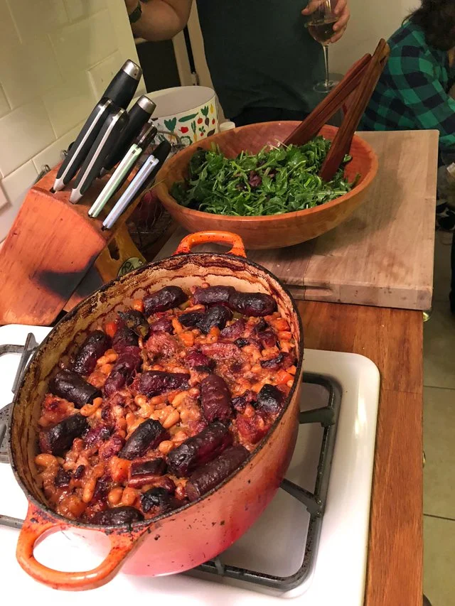 One of the nice things about making cassoulet for a dinner party is that it seems like a lot of work, but really it’s just a matter of soaking beans overnight (the only step you really need to do ahead), browning a bunch of meat the next day, adding vegetables, adding the beans, adding liquid, and cooking it in the oven for four hours.