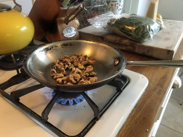 Watch this. Take a handful of walnuts, and toast them in a tiny skillet until fragrant. (You could also use pine nuts or almonds. Doesn’t matter. Whatever you have.)