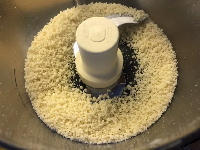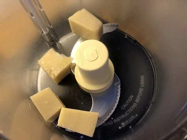 Meanwhile, cut a few chunks off a wedge of good Parmesan (you know it’s good because it’s a wedge and not pre-grated) and pop them into your food processor.