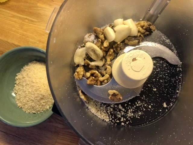 Dump that out, put the walnuts in (let them cool a little first) and a few cloves of garlic, as many as you like (three fat ones is a good way to go, but four works if you like things very garlicky). Add a pinch of salt for good measure.