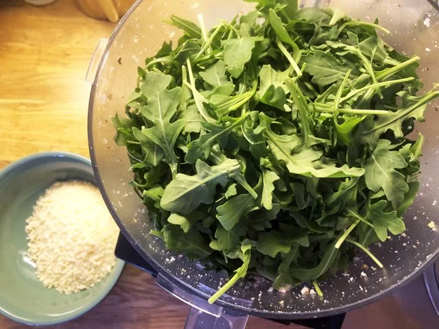 Blitz that, then add a BAG of arugula. You heard right: just buy arugula at the farmer’s market (that’s where I get mine, it’s extra peppery) or a box of organic arugula at the grocery store. The point is, unlike basil, you don’t have to do any stemming; you just put the whole bag in. Hence the INSTANT nature of this pesto. (I’d say it’s about three cups.)