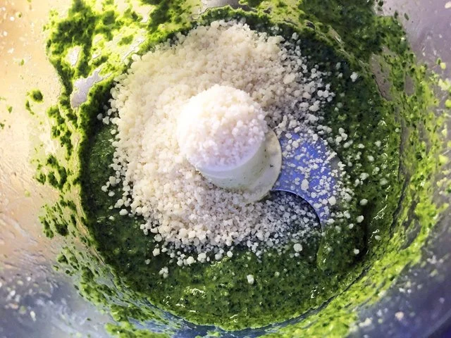 At this point, I add lemon juice (from about two lemons, but I like it zingy) then I put the lid on and slowly add olive oil through the feeding tube as the motor runs. About 3/4th a cup, but it could take a whole cup depending on how loose or thick you want your pesto. Ideally, you want it chunky.
