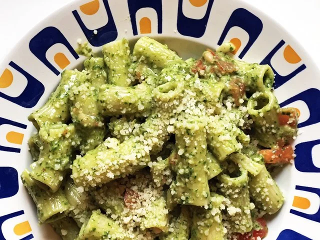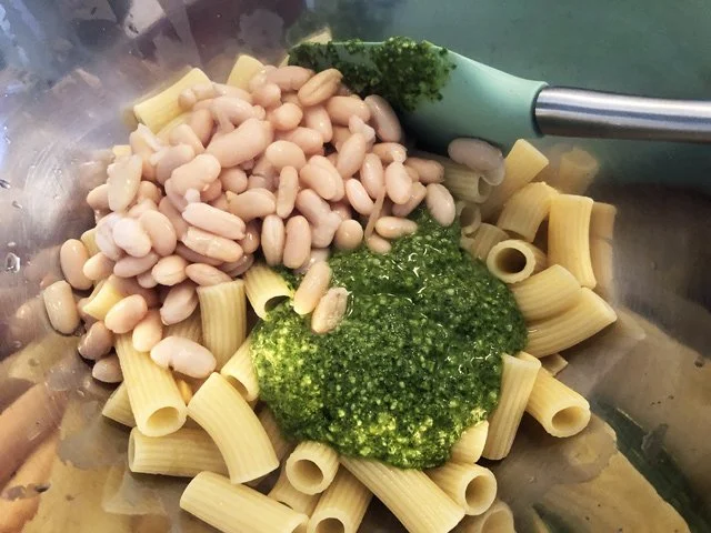 There’s so much you can do with pesto in the summer. You can toss it with green beans (see here). You can do what I did the night that I made this and toss it with rigatoni, white beans (drained from a can), and a chopped tomato. (Not pictured: the tomato.)