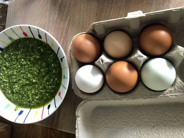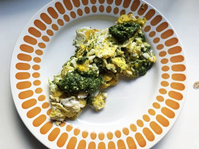 I just heated a little olive oil in a non-stick skillet, cracked in three eggs, scrambled with salt, and then stirred in a little pesto at the end.