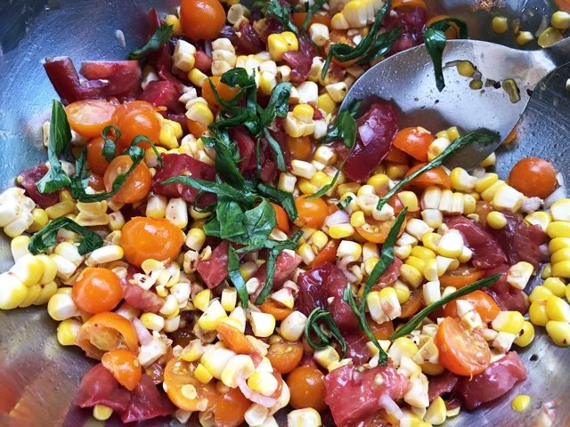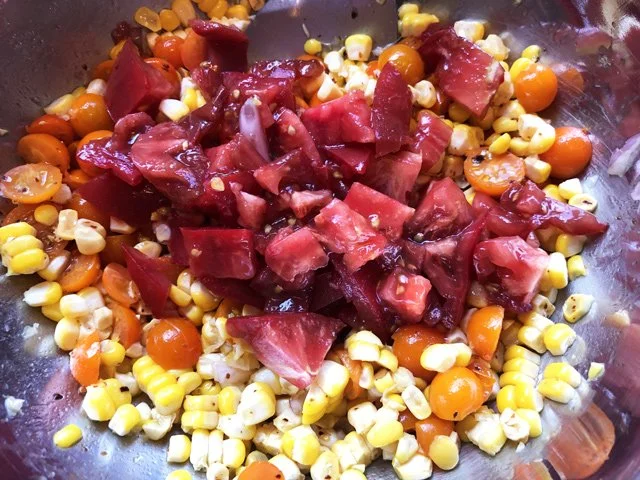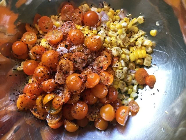 Use a sharp knife, cut the kernels off, and put them in a bowl. At this point you could add anything: I added a minced shallot and halved sungold tomatoes, along with olive oil, a splash of white wine vinegar, salt, and Aleppo pepper.