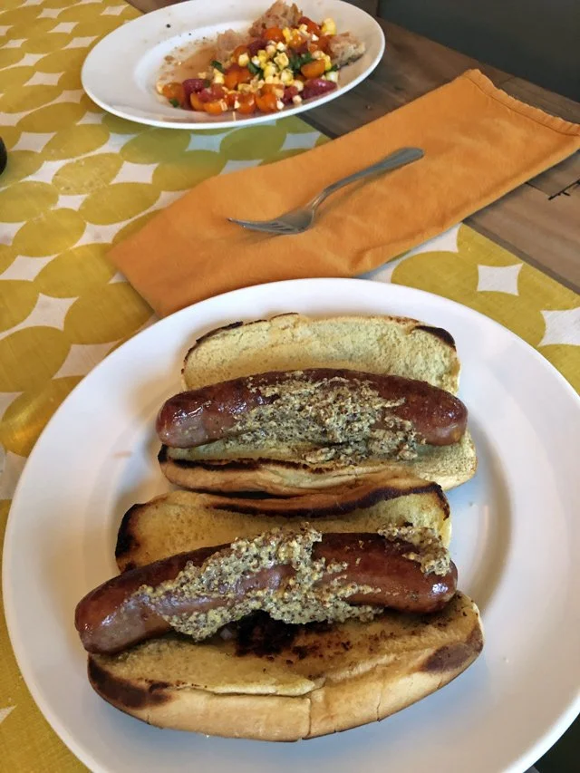 I put them on the buns, slathered with mustard, and served alongside the corn salad. I was going to put them on the same plate, but the corn salad got very wet, so this is a very unattractive picture. I’m not sure why I’m including it.