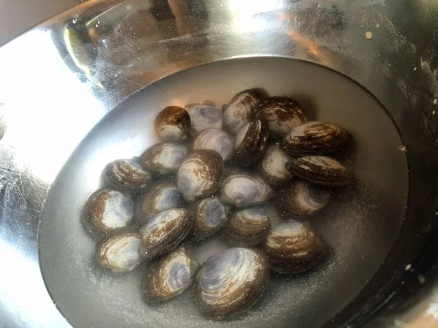 I always put clams in a bowl of cold water with a spoonful of flour to help draw out any grit. These clams were called “savory clams” which, according to the person who sold them to me, just meant they were a little brinier.