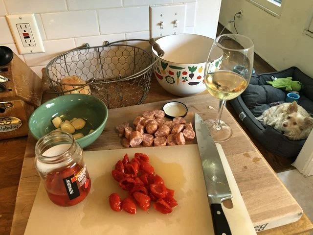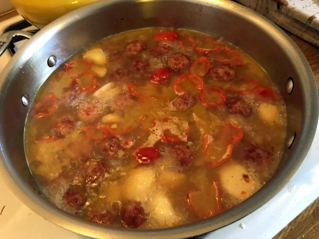 When everything is good and toasty (and not burned) add half a bottle of Sauvignon Blanc (be careful: I lower the heat before I added a liquid to a hot pan). (Also: I should say here that the sausage gave off a lot of fat, so I poured some off before adding the white wine.) I also added a splash of the Peppadew liquid, for a little zip. Then I added the sliced Peppadews and brought everything to a boil.
