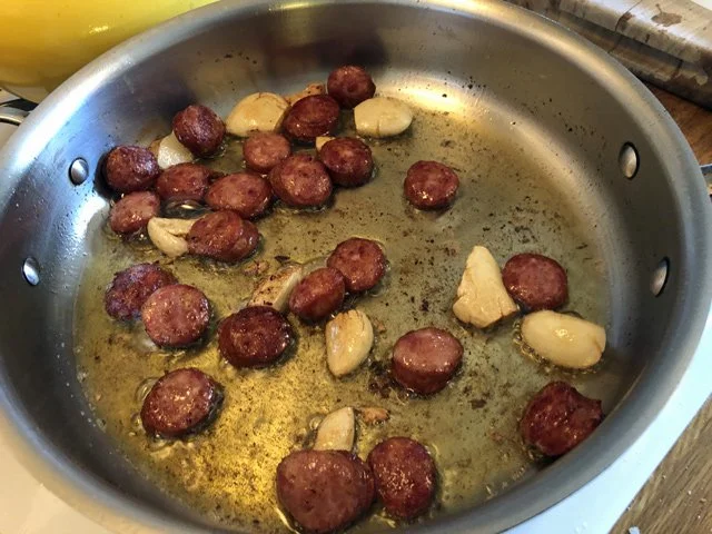 This is so easy and so incredible, you really should try it. All you do is heat a large skillet — big enough to hold everything, and one with a lid — with a splash of olive oil. When it’s hot, you add the sausage. Let it brown on one side, then stir all around, and add the garlic.