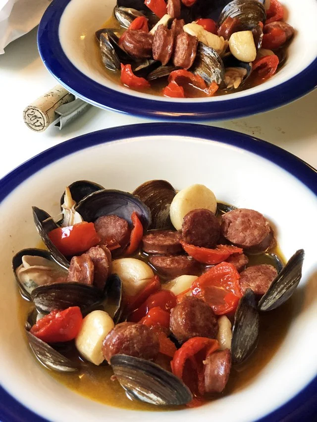 Ladle the sausage and Peppadews and garlic and broth over the clams in bowls.