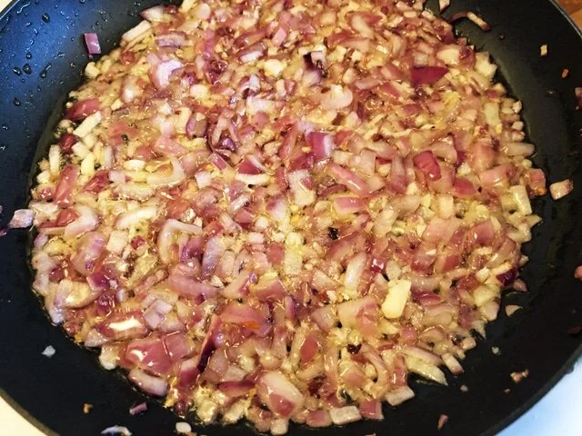 Here’s how easy this dinner was: when I got home, first thing I did was heat some olive oil in a non-stick skillet and while that was heating, I diced a red onion and threw that in, and then chopped two cloves of garlic and when the onion was soft (oh I added salt to it), I added the garlic and let that cook a little too.